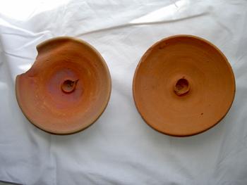 | (2 шт.) Древнерусский подсвечник (плошка керамическая не обоженная) для фитиля, наполняемая маслом. Использовалась древними ремеслинниками в граде Киеве ориентировочно с Х по ХII век. |
