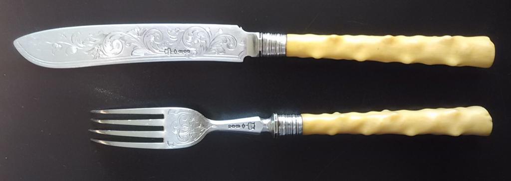 Посеребрение, гравировка, слоновая кость (присутствуют трещины), рестоврация не проводилась .