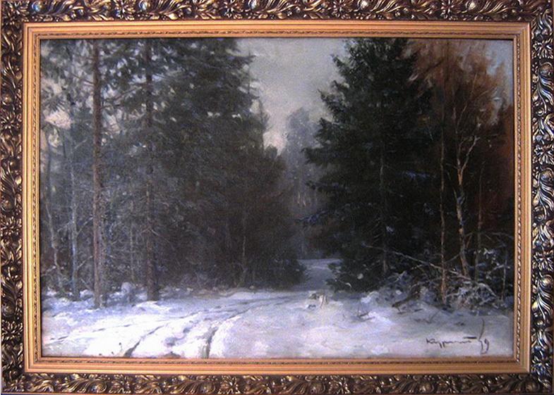 Лесная дорога зимой.Год создания-1949.Художник-Куракин Василий Васильевич. |